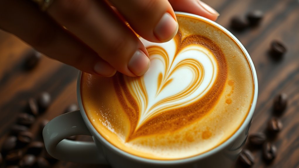 Maintaining a steady hand is essential for producing crisp, consistent latte art. Your grip stability directly influences control, so find a comfortable grip that minimizes unnecessary movement. Good hand coordination ensures smooth, deliberate motions. To improve, focus on these key techniques: