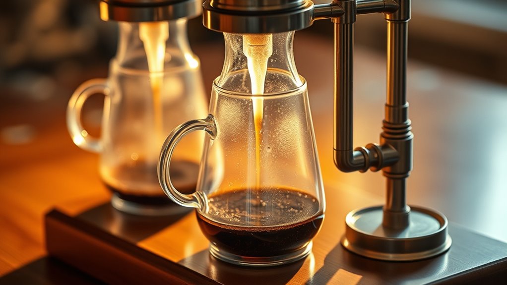 Siphon coffee brewing combines science and artistry to craft a rich, aromatic cup. You start by heating water in the lower chamber, which pushes it into the upper chamber filled with coffee grounds. After steeping, removing the heat pulls the brewed coffee back down through a siphon tube, producing a full-bodied flavor. The process’s visual appeal and unique technique make it a beloved method—if you want to explore all its tips and innovations, there’s much more to uncover.