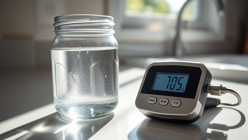Temperature variations can impact your TDS readings because they affect the meter’s accuracy. To guarantee precise results, you should perform temperature calibration regularly, especially if your water temperature fluctuates. When water is warmer, TDS levels might appear slightly higher, and cooler water can give lower readings. Always check your TDS meter’s instructions for calibration procedures to maintain measurement consistency and accuracy at home.
