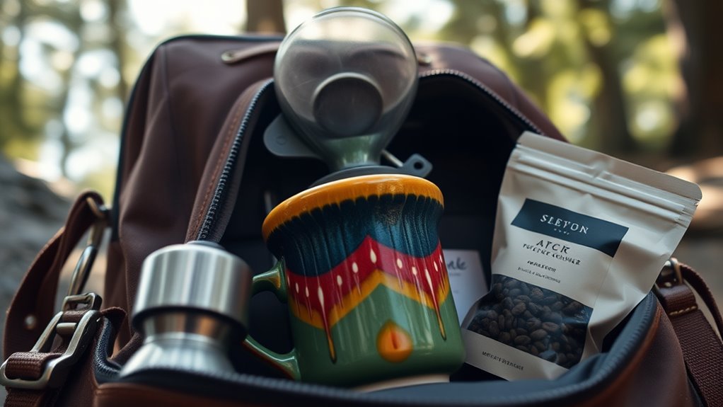 You should consider portable gadgets like a AeroPress or a pour-over kit, which are compact and easy to use on the go. These methods don’t require much coffee storage space and deliver great flavor. A French press travel mug is also handy for brewing and sipping on the same device. Keep your coffee stored in airtight containers, and you’ll enjoy fresh brews anywhere without adding bulk to your packing.