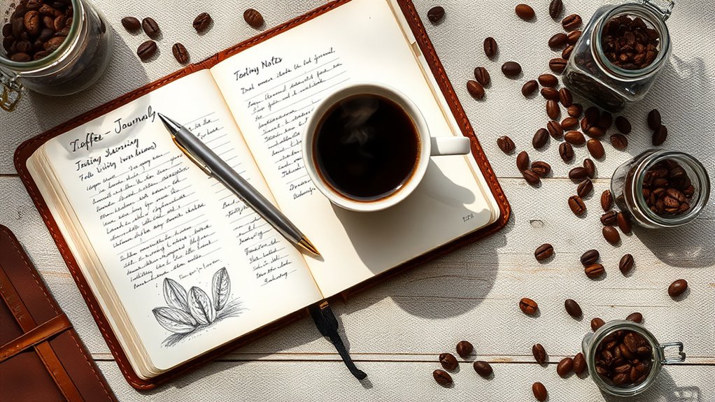 Ever wonder how to make your coffee tasting notes truly mesmerizing? You can add artistic embellishments like doodles, colorful borders, or handwritten styles to bring your notes to life. Use vivid sensory language to describe aroma, flavor, and mouthfeel, creating an immersive experience. Personal touches like quotes, poetry, or mood sketches deepen your connection to each brew, transforming simple notes into a creative, personalized coffee story you’ll love to revisit.