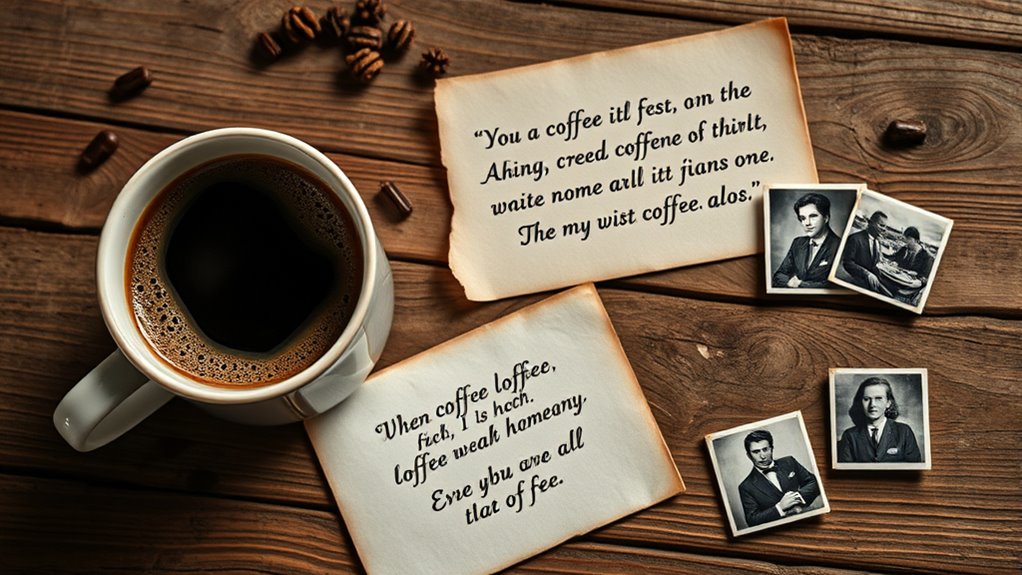 Like a secret whisper from the past, some coffee quotes are tied to historical events. You might discover quotes linked to revolutions or peace treaties, serving as symbols of change. These anecdotes reveal the quote origins and their significance during pivotal moments. For example, a quote about unity might have emerged during a national movement, capturing the essence of that time. Such literary ties enrich our understanding of history through coffee’s cultural lens.
