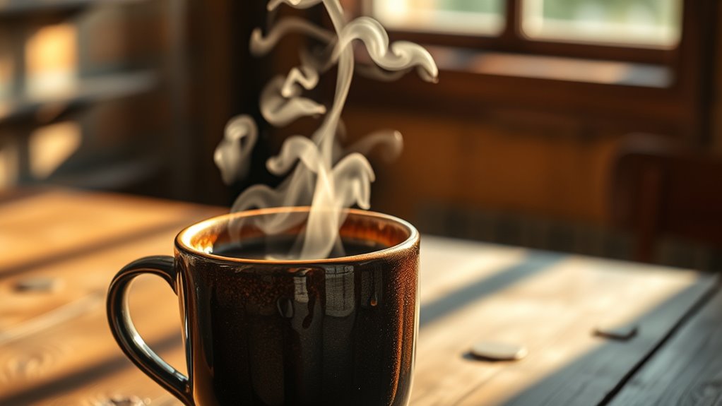 To capture cozy coffee steam shots, use soft, natural or diffused lighting, positioning it behind or beside the cup to create a gentle glow around the vapor. Keep your background simple and contrasting to make the steam pop, and compose slightly downward so wisps drift upward naturally. Patience is key—wait until the coffee is hot enough, then take multiple shots with a steady hand or tripod. With some tweaks, you’ll uncover more tips for capturing those perfect, inviting steam shots.