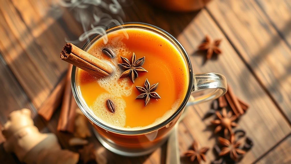 The growing popularity of fusion variations has introduced more people to the health benefits associated with masala chai. This flavorful beverage can boost your immune system and provide stress relief. When you sip on masala chai, you’re consuming spices like ginger, cardamom, and cinnamon, known for their antioxidant properties. These ingredients help strengthen your immune system, making it easier to fight off illnesses. Additionally, the warm, aromatic blend can calm your nerves and reduce stress. Here are some key benefits: 1. Immune boost from antioxidants and anti-inflammatory spices 2. Stress relief through the calming aroma and flavors 3. Improved digestion from ginger and cardamom 4. Enhanced alertness with moderate caffeine levels. Incorporating antioxidants through ingredients like cinnamon and ginger can further amplify these health benefits. Understanding home security system costs can help you make informed decisions when choosing safety solutions for your home. Exploring the nutritional profile of masala chai can deepen your appreciation of its health advantages. Furthermore, the cultural significance of masala chai highlights its role in social and traditional settings worldwide. Preparing masala chai with fresh spices can maximize its flavor and health benefits, making each cup both delicious and nourishing. Enjoying masala chai offers both comfort and health perks worldwide.