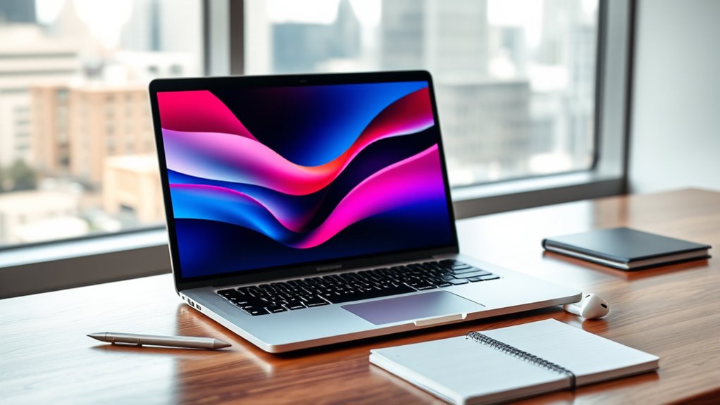 The way your MacBook Pro fits into your broader Apple ecosystem can considerably influence your overall user experience. Seamless sharing of files, messages, and calls across devices like iPhone and iPad makes daily tasks smoother. Features such as Handoff and iPhone Mirroring let me start a task on one device and effortlessly continue on another. AirDrop speeds up file transfers, keeping them secure and quick. Deep integration with macOS and iOS enables conveniences like opening the MacBook with my Apple Watch or automatically opening when nearby. These ecosystem capabilities boost productivity by syncing notifications, sharing clipboards, and enabling universal control. Choosing a MacBook Pro that maximizes ecosystem integration guarantees I stay connected and efficient across all my Apple devices.