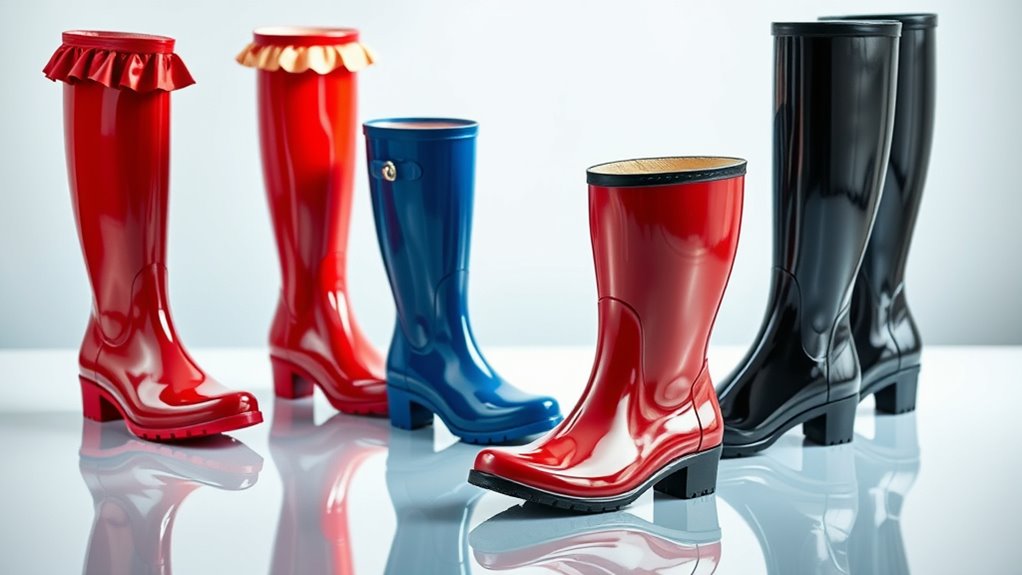 Ensuring waterproof performance in designer rain boots starts with selecting high-quality materials like durable rubber or synthetic fabrics that keep water out effectively. Look for boots with sealed or taped seams, as these prevent leaks where water might seep in. The construction technique is vital to maintain water resistance, especially in heavy rain. Additionally, boots with textured, slip-resistant soles offer better traction on wet surfaces, reducing slip risks. The height of the boots matters too—mid-calf or knee-high styles provide more coverage against splashes and deep puddles. Some designs incorporate ventilation features like mesh footbeds or breathable membranes, balancing waterproofing with moisture management inside the boots. Prioritizing these factors ensures your boots keep your feet dry and comfortable in rainy conditions.
