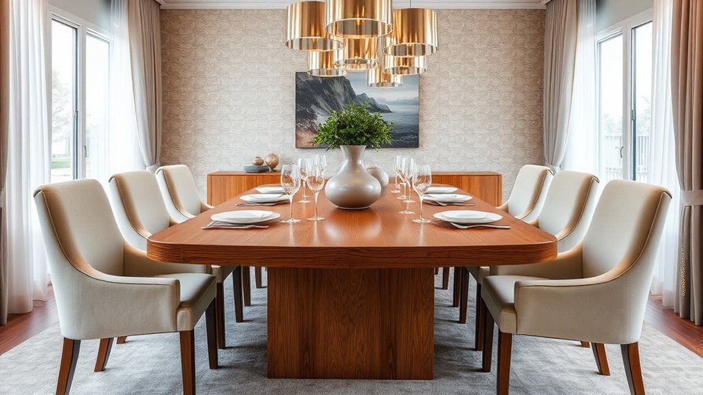 You should measure your space carefully before choosing a table size. I always leave at least 36 inches of clearance around the table for comfortable movement. If your room is small, opt for a round or compact table to maximize space. For larger rooms, a bigger table works well, but guarantee it doesn’t overwhelm the room. Accurate measurements help create a balanced, functional, and stylish dining area.