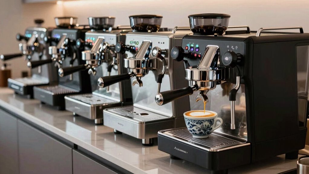 Ever wondered how some espresso machines deliver a shot in just seconds, making busy mornings a breeze? The secret is in their quick brew speed and advanced heating systems. Machines with rapid heating, like Thermo Block or PID-controlled boilers, can be ready in under 40 seconds, minimizing wait times. High-pressure systems, such as 20-bar pumps, extract coffee more efficiently, resulting in richer flavors and faster shot pulls. Features like automatic pre-infusion and temperature stabilization help maintain consistent brewing speeds and quality. Additionally, the overall cycle, from grinding to extraction, affects how quickly you can make multiple cappuccinos back-to-back. When choosing an espresso machine, prioritize those with quick heat-up times and efficient extraction to keep your caffeine routine smooth and swift.