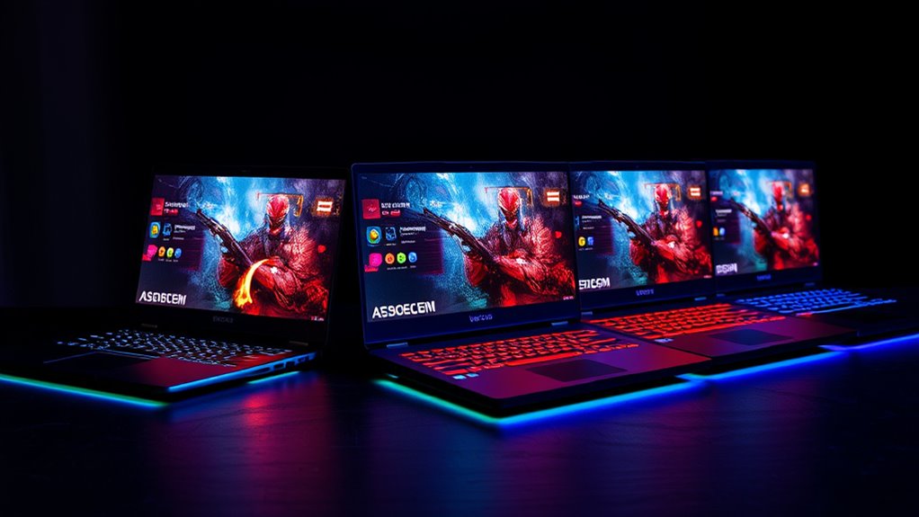 When selecting a gaming laptop under $1000, display quality and refresh rate are critical for an immersive experience. A resolution of at least 1080p guarantees sharp, clear visuals that bring games to life. A high refresh rate of 144Hz or more is essential for smooth motion, especially in fast-paced titles. I prefer IPS panels because they offer better color accuracy and wider viewing angles, making gameplay more vibrant and consistent from different positions. Brightness levels of 300 nits or higher help maintain visibility in well-lit environments, preventing glare from ruining the experience. Additionally, features like G-SYNC or FreeSync can markedly reduce screen tearing, providing fluid, tear-free visuals. Prioritizing these aspects will enhance your gaming experience without breaking the bank.