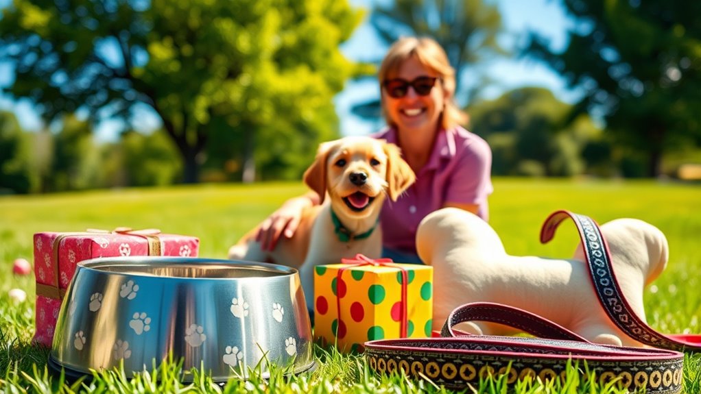 Think of practical gifts for new dog owners as sturdy bridges that support their journey. I’d recommend essentials like a durable leash, comfy bed, grooming supplies, and nutritious treats. These items help new pet parents navigate their first adventures smoothly while ensuring their furry friend’s comfort. I always suggest focusing on quality and safety—after all, these gifts create a foundation for a happy, healthy bond from the very start.