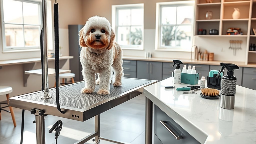 When choosing a grooming table, I always look for non-slip surfaces to prevent falls and sturdy, adjustable arm restraints to keep pets secure. I also prioritize tables with rounded edges for safety and stable, slip-resistant feet to prevent wobbling. These features make grooming safer and easier, giving both the pet and groomer peace of mind. Safety should always come first to guarantee a stress-free grooming experience.