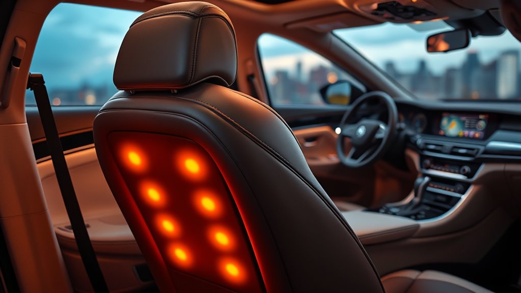 High-end car seat massagers offer a variety of features that substantially enhance the relaxation experience. Extras like heating, cooling, vibration, and traction target specific muscle groups, providing deeper relief and comfort. Multi-mode options let me customize massage intensity, focus areas, and session length, making each drive uniquely relaxing. Safety features such as auto shut-off, overheating protection, and adjustable straps ensure secure, worry-free use during long trips. The ergonomic designs and adjustable settings accommodate different body sizes and seating positions, maximizing comfort. Integrated remote controls and mobile app compatibility give me easy access to various massage modes and settings without distraction. These features not only boost relaxation but also make the massage experience more personalized, safe, and effortless, elevating my driving comfort to a whole new level.