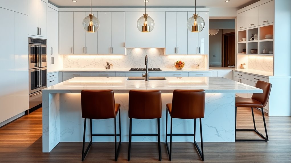 I recommend choosing durable materials like quartz, granite, or stainless steel for luxury kitchen islands. These materials withstand daily wear and tear, resist scratches, and are easy to clean, ensuring your island stays beautiful over time. I personally prefer quartz for its combination of durability and elegance. Investing in high-quality materials not only enhances the look but also guarantees longevity, making your kitchen both functional and stylish for years to come.