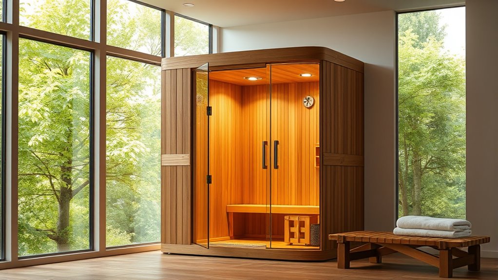 If you’re looking for the best home sauna kits for relaxation and wellness in 2025, I’ve got you covered. I’ve explored options like infrared, steam, portable, and traditional models, all designed to fit different spaces and budgets. These saunas offer rapid heat-up, therapeutic benefits, and modern features like Bluetooth and customizable lighting. Keep going, and you’ll discover detailed insights into each type, so you can find the perfect one to enhance your wellness routine.