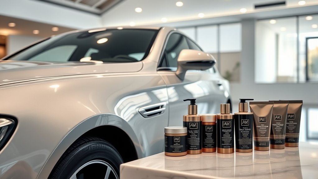 Choosing the right luxury car wax or detailing kit starts with making certain that it’s compatible with your vehicle’s specific surfaces. First, verify the product works with your paint finish—whether it’s clear coat, matte, or satin—to avoid any damage or dulling. Check the product specs to confirm it’s safe for plastics, rubber trims, glass, and painted areas, preventing discoloration or degradation. It’s also essential to make sure the product matches your existing coatings, like ceramic, sealant, or traditional wax, for the best results. Additionally, review the recommended surface temperatures; applying within the right temperature range prevents streaks or uneven coverage. Finally, confirm the product’s safety on sensitive parts such as black trims and rubber seals to avoid unwanted residue or discoloration.
