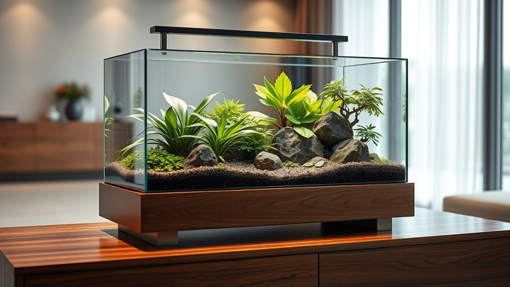 Lighting options in luxury terrarium designs are like the finishing touch on a masterpiece. I love integrating LED systems that mimic natural sunlight, providing essential UVB rays and creating a warm ambiance. Automated lighting schedules keep your reptile’s environment consistent, while sleek fixtures blend seamlessly with elegant decor. Proper lighting not only enhances the aesthetic but also promotes health, making your terrarium both stunning and functional.