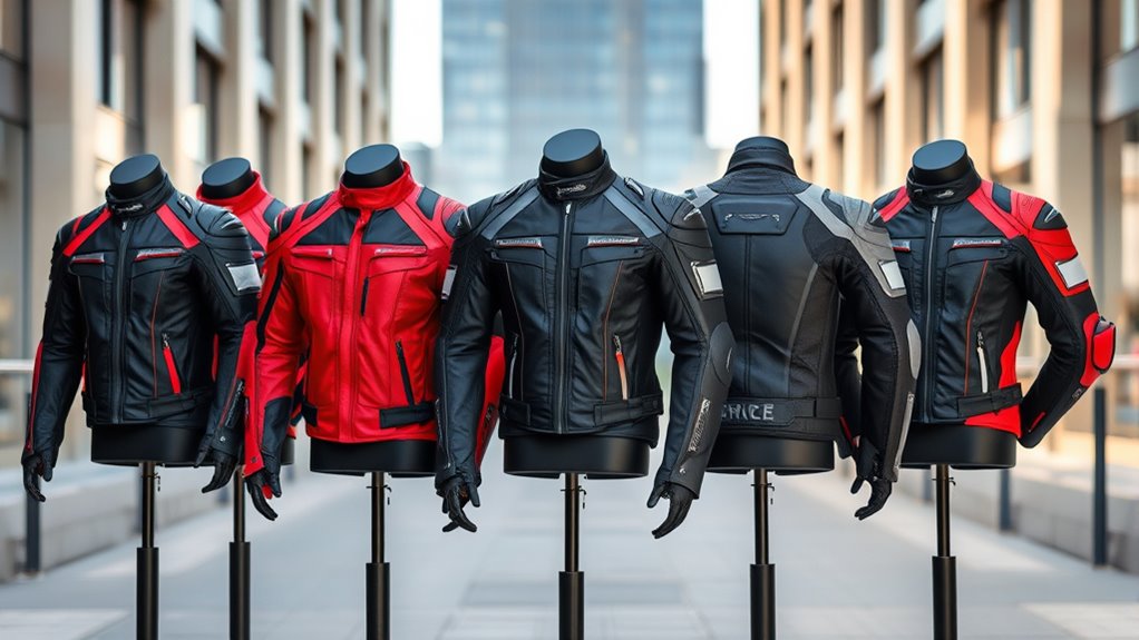Impact protection is a critical factor to contemplate because it directly affects your safety in the event of a fall or collision. I look for jackets with CE-certified armor in key areas like shoulders, elbows, and the back, as these considerably boost impact safety. Removable padding is a plus, letting me customize protection based on riding conditions and comfort. Proper fit and placement of protective pads are essential; well-positioned armor offers better coverage, while poorly fitted pads can leave me exposed. The durability of protective features matters too — reinforced stitching and high-impact foam ensure long-lasting safety. Importantly, I want protection that doesn’t compromise mobility or comfort, so I can move freely without sacrificing safety on the road.