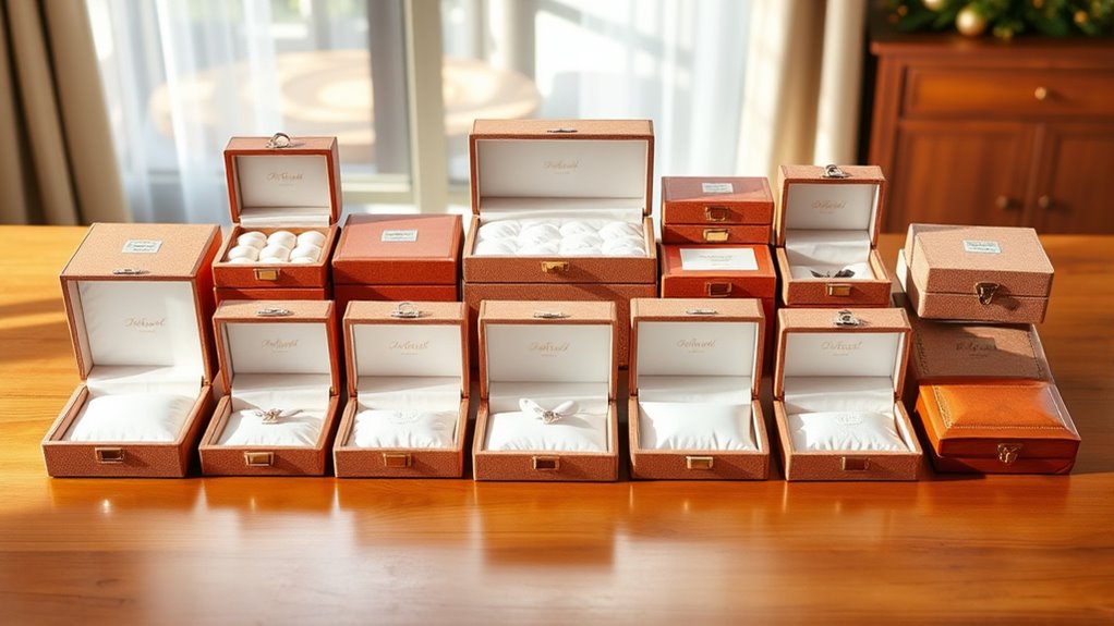 When selecting drop-proof ornament storage boxes, I focus on impact-resistant materials and reinforced designs to safeguard my valuables. It’s also essential to make certain the box has secure closures and enough cushioning space to absorb shocks. Certifications like drop-test approval can give added confidence in the box’s durability during handling and storage.