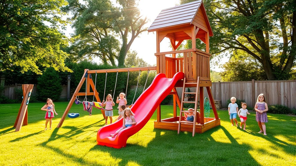 Choosing the right outdoor playset is like planting a sturdy tree—great options grow with your kids’ imaginations and energy. I remember watching my kids giggle on their new swing set, feeling like they’d discovered their own little kingdom. Just like a tree needs strong roots, your choice should offer safety, fun, and durability. With the right set, you’re not just investing in toys—you’re planting memories that will flourish year-round.