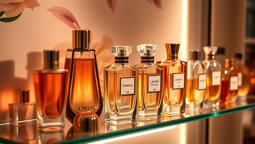 Choosing a perfume for 2025 involves considering how long it lasts and how far its scent projects. Longevity measures how long the fragrance remains noticeable on your skin or clothes, often thanks to base notes and fixatives that help it stick around. Sillage, on the other hand, is about the trail or aura your scent leaves behind—how others perceive you from a distance. A high sillage means your perfume projects well and makes an impression even when you’re not close. Striking the right balance between longevity and sillage is key; you want your fragrance to last without overpowering. When choosing a scent, think about your daily activities and environment to find a perfume that’s long-lasting and appropriately noticeable.