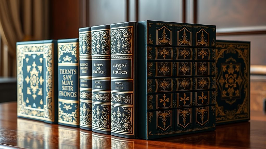 Have you ever considered how extras can elevate a book box set from a simple gift to a cherished keepsake? When choosing a set, I look for additional items like posters, bookmarks, or exclusive collectibles that add value and excitement. Bonus content, such as behind-the-scenes extras or signed editions, can make the gift truly special. I also assess the quality and presentation of these extras, ensuring they feel durable and attractive while complementing the main books. Thematic alignment is important too—extras should enhance the overall experience and resonate with the story. Finally, I check that the packaging and presentation of the extras are pristine and gift-ready, ensuring everything arrives in perfect condition and makes a memorable impression.