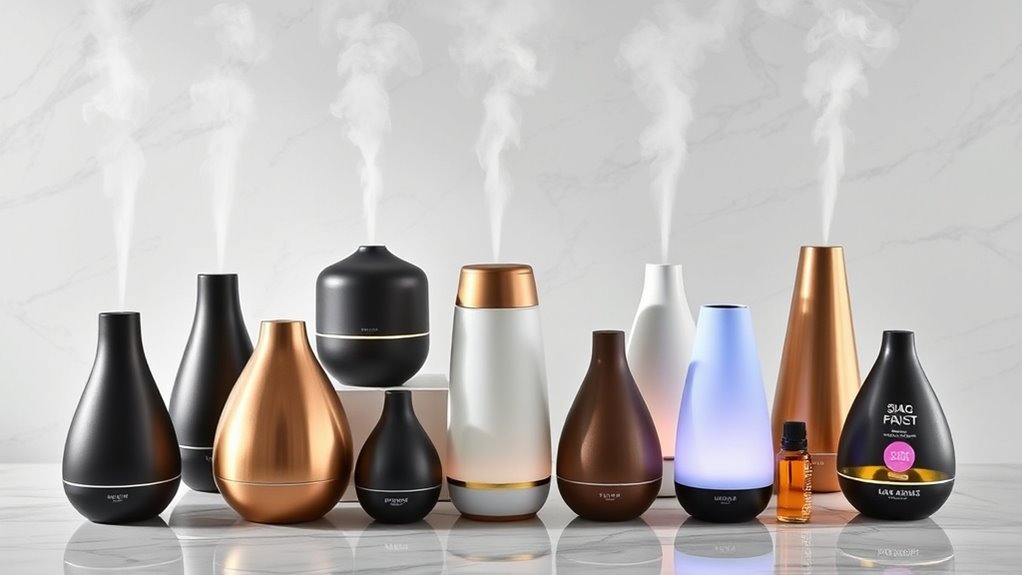 If you’re looking for the 15 best premium aromatherapy diffuser sets to create a luxurious, relaxing atmosphere, I’ve got you covered. These sets feature large-capacity diffusers with ultrasonic technology, adjustable lighting, and quiet operation, perfect for any space. They include high-quality essential oils like lavender, eucalyptus, and citrus, enhancing your wellness routine. From sleek designs to advanced features, these options offer elegance and functionality. Keep exploring, and you’ll discover how these sets can transform your environment into a calming sanctuary.