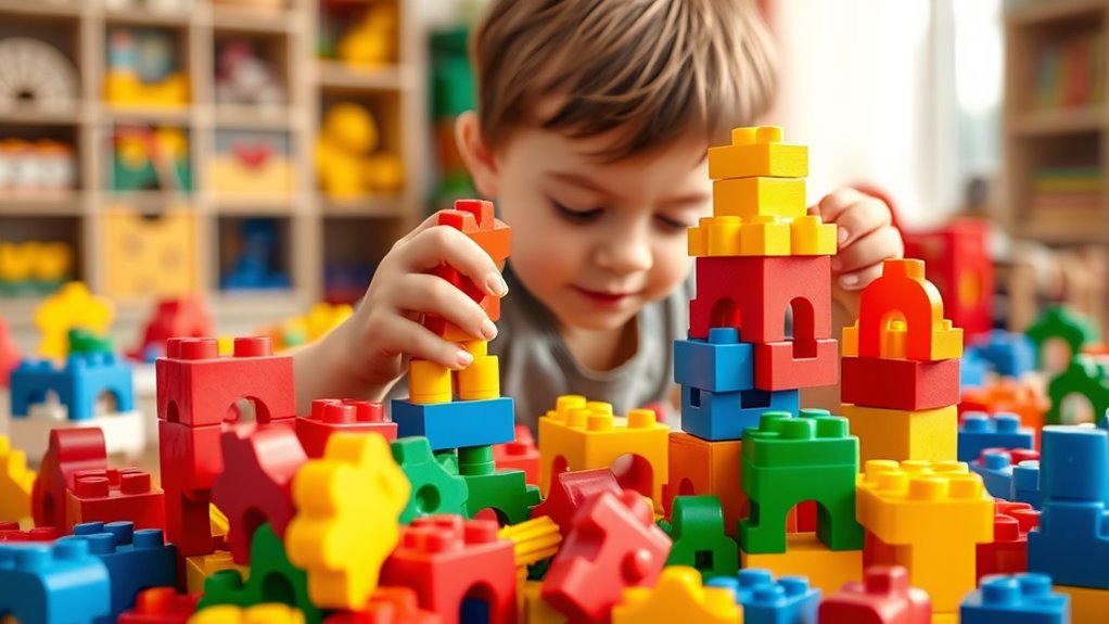 I recommend choosing building blocks made from high-quality, non-toxic, BPA-free plastics or sustainably sourced wood. These materials are durable, safe, and resistant to wear and tear. I always look for sets that meet safety standards like ASTM or CE certifications, ensuring they’re free from harmful chemicals. Solid wood blocks are especially great because they’re sturdy, long-lasting, and provide a natural feel that promotes safe, imaginative play.