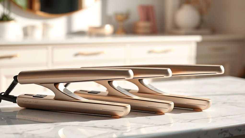 Achieving perfect styling results depends heavily on precise temperature control, which guarantees consistent heat delivery and minimizes the risk of damaging your hair. Digital or LED displays make it easy to monitor and adjust the temperature accurately, often in 1-10°F increments, giving you better control over your styling process. Adjustable temperature ranges, typically from 250°F to 450°F, let you tailor the heat to suit your hair type—delicate, fine, or coarse—ensuring ideal results without unnecessary damage. Some models even feature smart sensors that automatically regulate temperature based on hair thickness or moisture levels, enhancing styling efficiency. Maintaining a consistent temperature throughout your session prevents uneven heat distribution and damage, helping you achieve sleek, long-lasting styles every time.