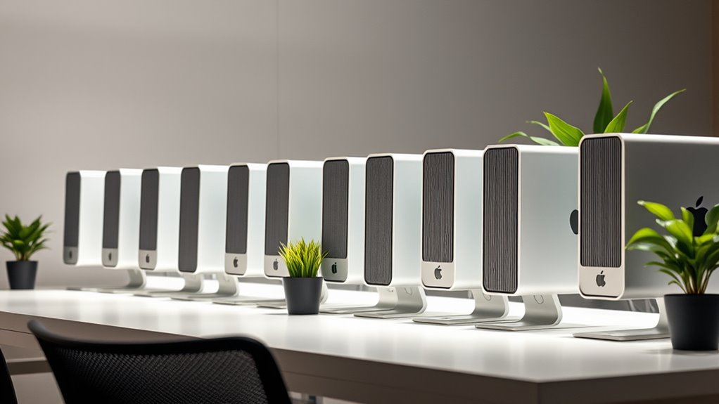 Ensuring your renewed Mac Studio supports the latest macOS version is key to accessing new features and keeping your system secure. Compatibility with current macOS guarantees you benefit from the latest security patches and improvements. It’s also vital to verify that essential professional software, like Adobe Creative Cloud or Microsoft 365, runs smoothly without issues. Check if firmware and driver updates are available from Apple or authorized refurbishers, as these maintain ideal hardware-software integration. Confirm that the warranty covers software support and updates, so troubleshooting remains straightforward. Finally, review the seller’s reputation for providing timely software support and assistance, especially for refurbished units. This guarantees your Mac Studio remains up-to-date, secure, and ready for demanding workflows.