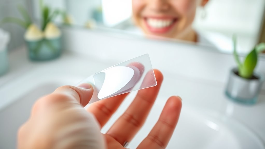If you have sensitive teeth, selecting whitening strips that prioritize comfort is essential. Look for products with lower peroxide levels, as these reduce irritation while still whitening effectively. Ingredients like hydroxyapatite, coconut oil, or natural enzymes can protect your enamel during treatment. Features such as non-slip, dissolvable, or dry strips help guarantee a comfortable fit and minimize gum contact, lowering sensitivity risk. Additionally, soothing agents like potassium nitrate or aloe vera can calm discomfort. Adopting a gradual, multi-session approach with longer wear times or lower active ingredients allows you to brighten your teeth without the pain. Prioritizing these factors helps you achieve your whitening goals while keeping sensitivity at bay, making the process more comfortable and sustainable.