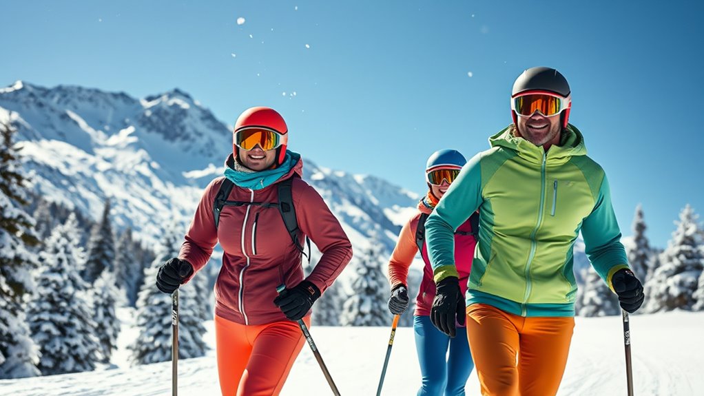 To guarantee your thermal underwear works well with your ski gear, it’s essential to select pieces that are slim-fitting and designed for layering. Slim-fitting thermals prevent bulk under your outer layers, allowing for comfortable movement. Look for moisture-wicking fabrics that dry quickly and maintain insulation, even when layered. Flatlock seams and seamless designs are crucial—they minimize chafing during long days on the slopes. Breathability is also key; it ensures proper airflow, preventing overheating while staying warm. Additionally, verify that the size and stretch of the thermal underwear allow for easy layering without restricting movement or feeling tight. When these factors align, your thermals will seamlessly integrate with your ski gear, keeping you warm, dry, and comfortable from first lift to last run.