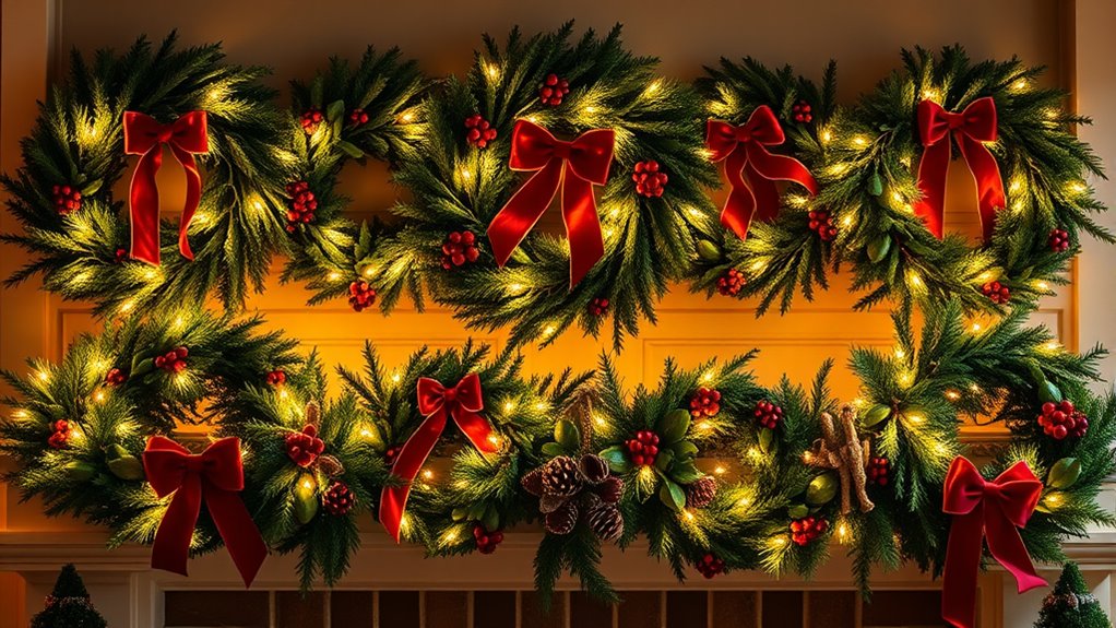 Choosing the right size and scale for wreaths and garland sets is essential to achieving a balanced and cohesive mantel display. I recommend measuring your mantel’s length and height to select pieces that complement its proportions. A wreath or garland that matches or slightly exceeds your mantel’s width creates a harmonious look, while ensuring it doesn’t overpower the space. For wider mantels, opt for sets at least 24-36 inches long to fill the area effectively without gaps. Pay attention to the diameter of individual wreaths and the length of garlands to ensure they fit comfortably and look proportional. Balancing the size of your decor with surrounding accessories helps create an inviting, well-styled holiday display that feels both intentional and festive.